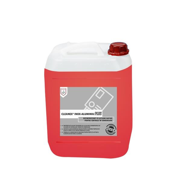 Gyorsan ható professzionális savas tisztítószer mélytisztításokra, a központi fűtőberendezések hőcserélőiben és kondenzációs központi fűtőrendszerekben lerakódott vízkőlerakódások eltávolítására. A CLEANEX Inox-Alumínium Plus korróziógátló adalékanyagai biztosítják az alumínium, öntöttvas, acél és réz alkatrészek optimális védelmét. Cinkhez nem ajánlott. A termék reakciógyorsító adalékanyagokat tartalmaz, amelyek a klasszikus termékekhez képest 30%-kal csökkentik a munkaidőt.